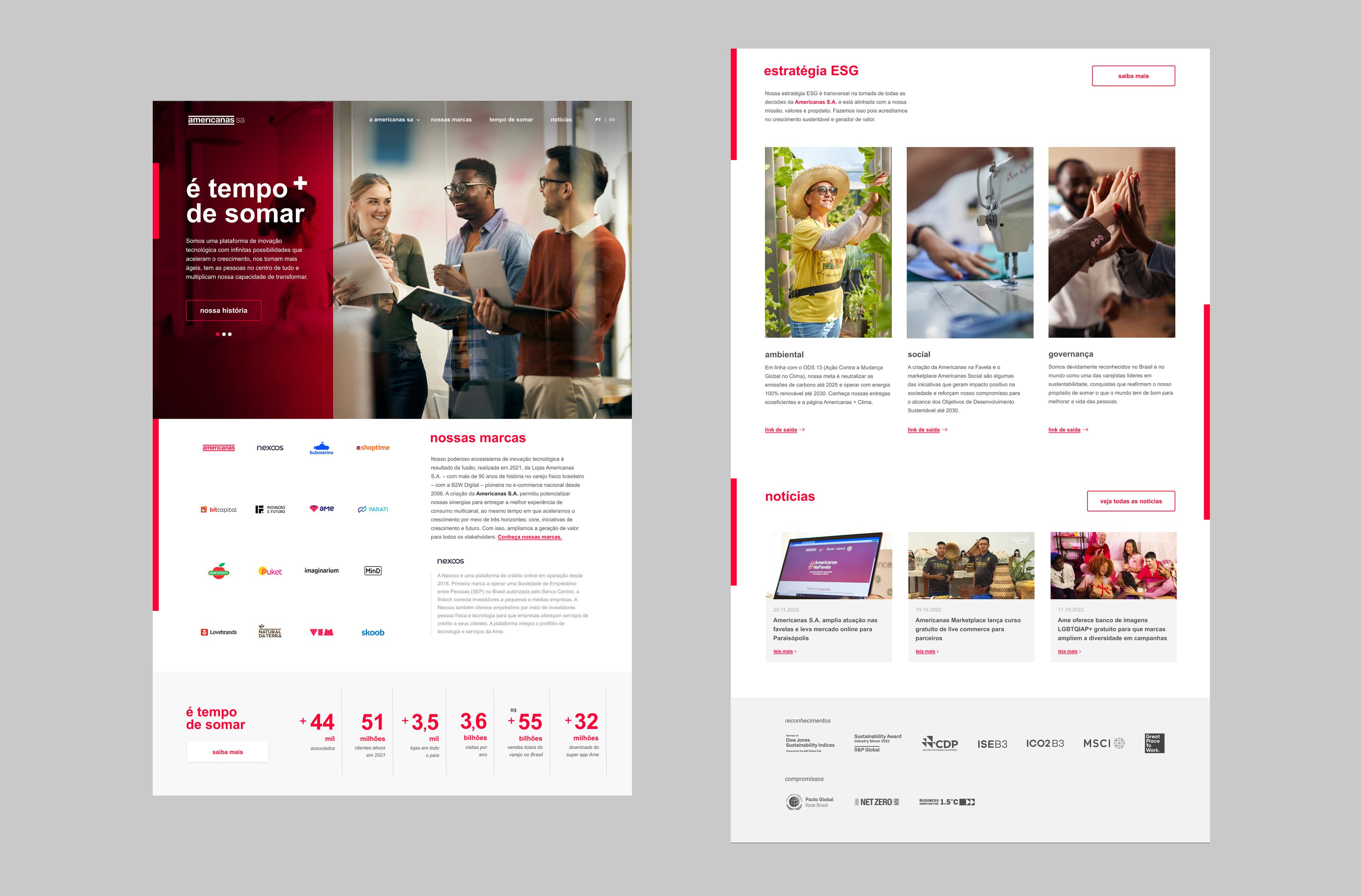 Americanas SA set out to unify its institutional and investor relations websites into a single, newly designed platform. To achieve this, our design team conduct a Sprint aimed at addressing the core needs of each context and building a cohesive brand identity for the new environment. Beyond the unified platform itself, new features and interactive elements were developed to support Americanas SA’s visual storytelling, including an interactive timeline, a news portal, a social projects portfolio, and a comprehensive ecosystem showcasing the company’s brands and sub-brands.
