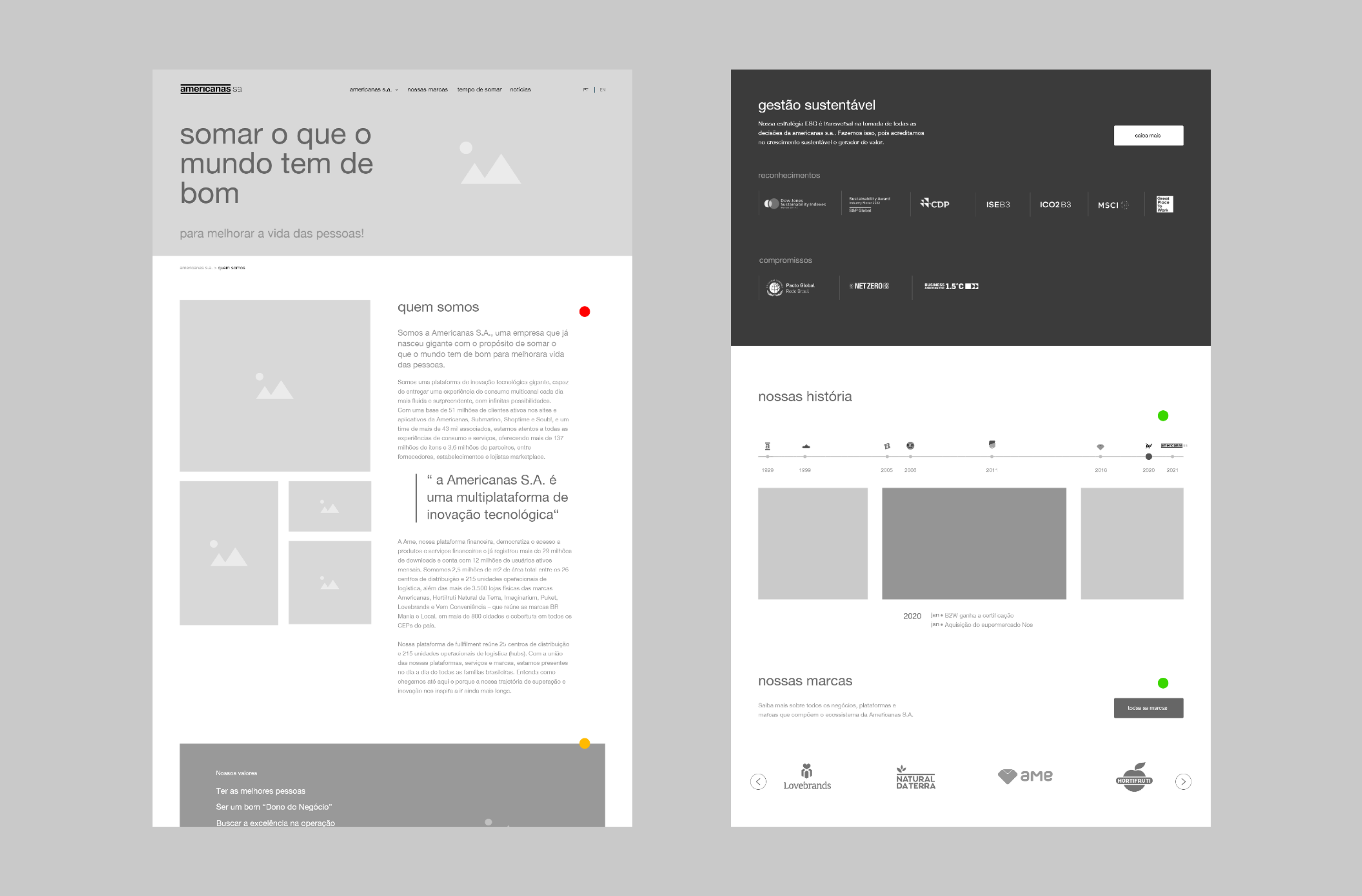 One of the primary goals of the new platform was the creation of an interactive, internally managed timeline highlighting Americanas SA’s key milestones. This tool emerged from the growing number of achievements and brands developed by the company over the years. To provide a clear, comprehensive view of this trajectory, we designed a responsive timeline with a dual-axis navigation system: milestone bullets along the line and complementary side slides.
